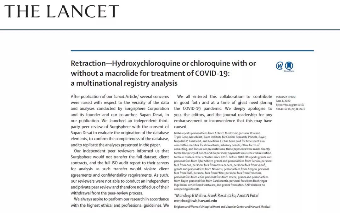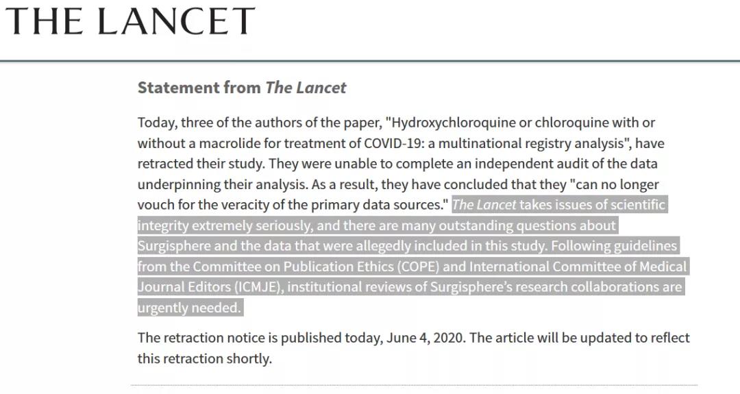 6月4日,《柳葉刀》宣布撤稿,并且徹底審查關于羥基氯喹臨床研究論文數(shù)據(jù)來源。