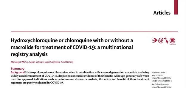 2020年5月22日,哈佛醫(yī)學院Mandeep R Mehra團隊在國際頂級醫(yī)學期刊Lancet 在線發(fā)表題為“Hydroxychloroquine or chloroquine with or without a macrolide for treatment of COVID-19: a multinational registry analysis”的論文,該研究發(fā)現(xiàn)羥氯喹治療新冠肺炎會導致死亡率及心率失常都會增加。