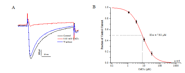 Effect of inhibitor (CdCl2) on the L-type Ca channel in cardiomyocytes isolated from guinea pig