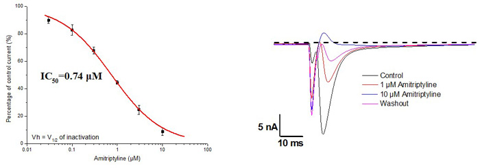 注:1)陽性對照10 μM Amitriptyline將作用于所測試的細胞以保證細胞鈉通道的反應(yīng)正常。