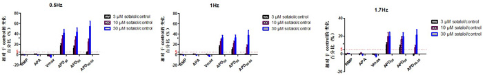 根據(jù)上圖所示,兔心臟蒲氏纖維的動作電位對索他洛爾具有濃度及頻率依賴性,隨著刺激頻率的增加或者濃度的增加,APD50/90皆有明顯的遞增延長。
